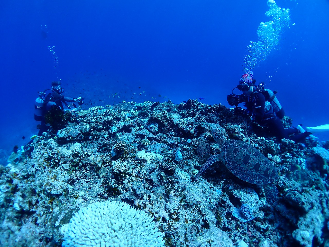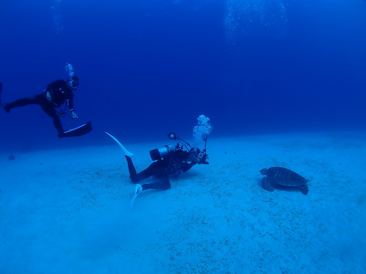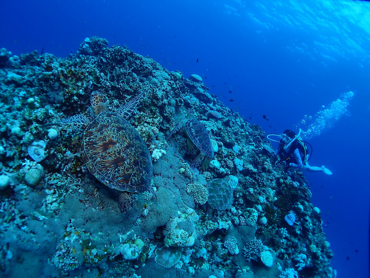全然逃げないアオウミガメ3匹。こちらにお構いなさそうで何より。
