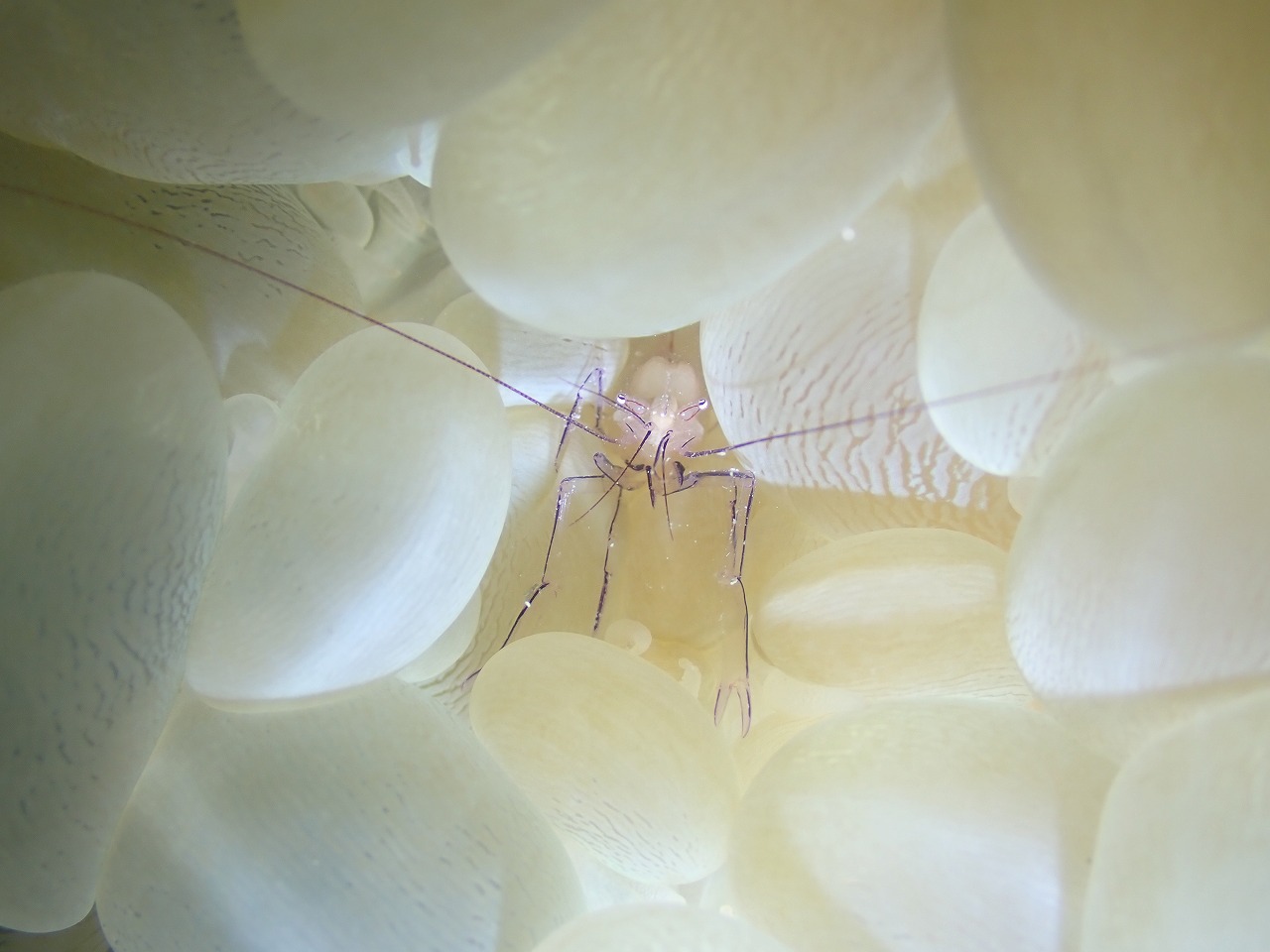 透明度1~2m?作業が早く終わったので船の下でバブルコーラルシュリンプを紹介。最近見ないもんなー。
