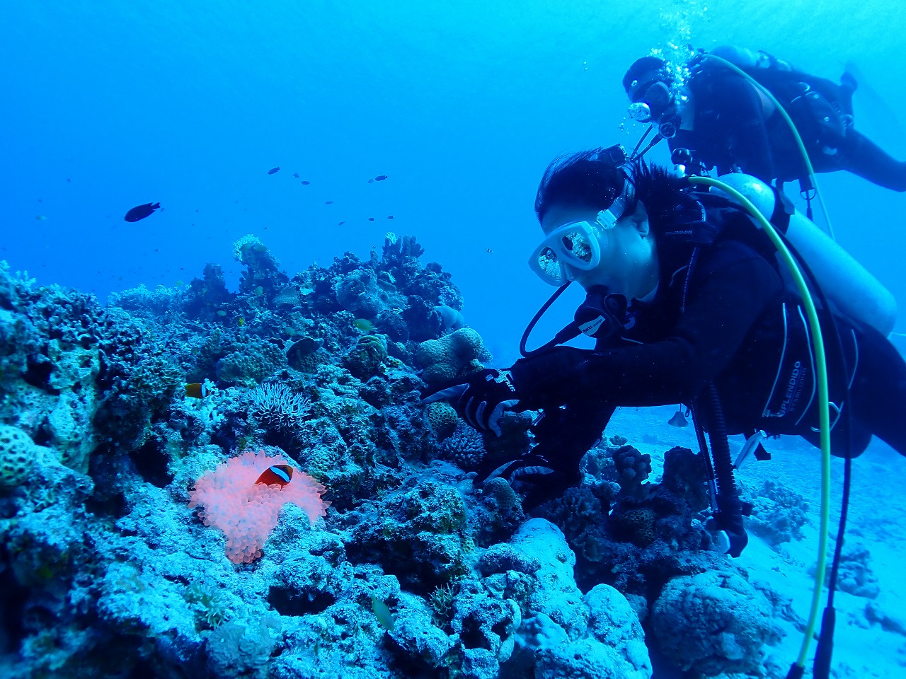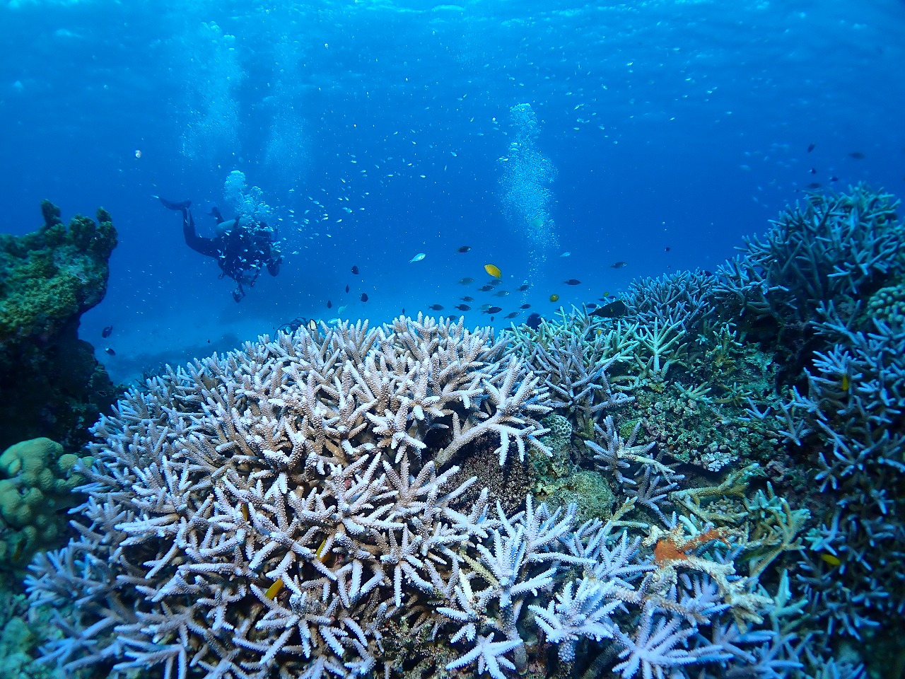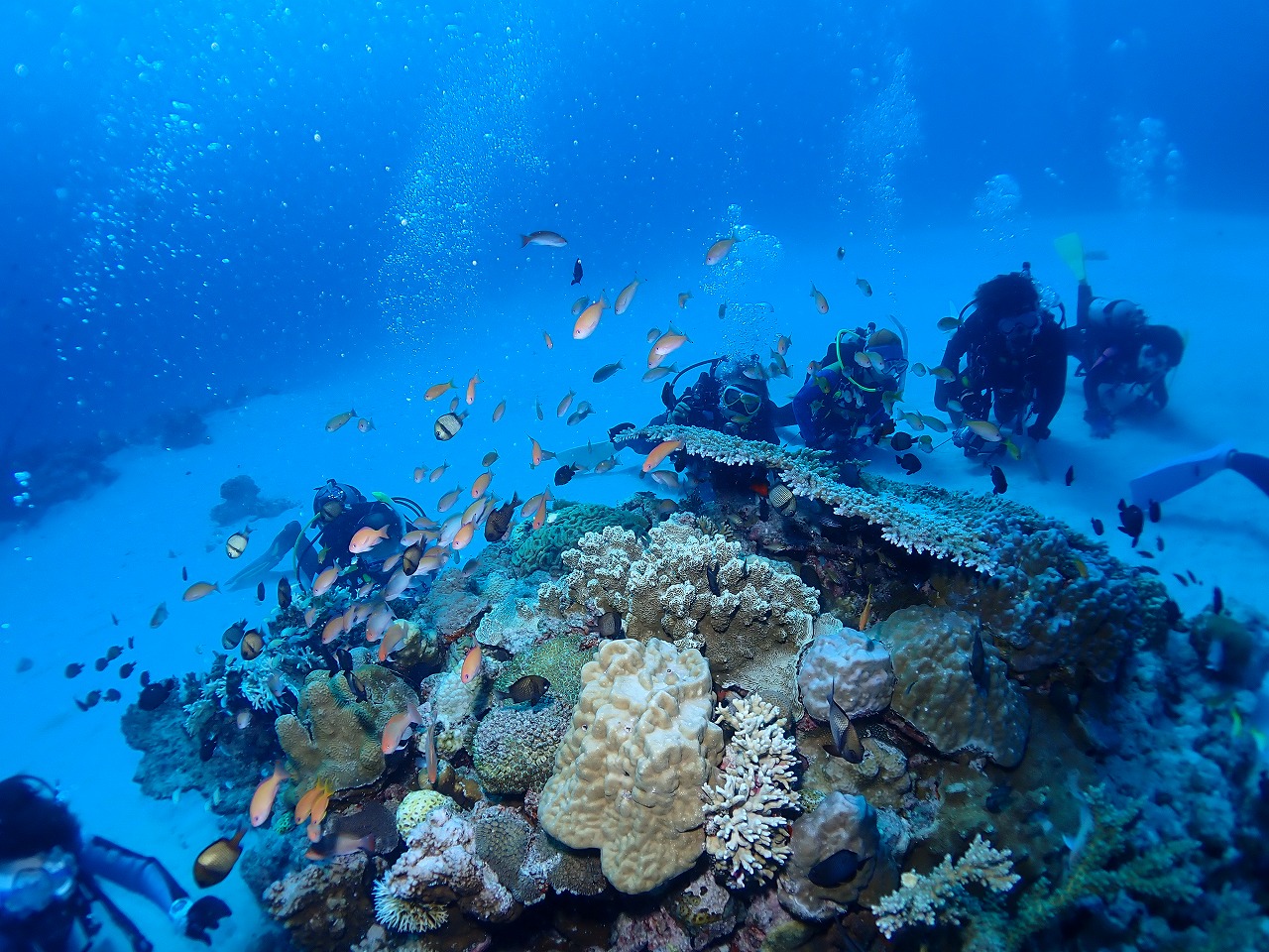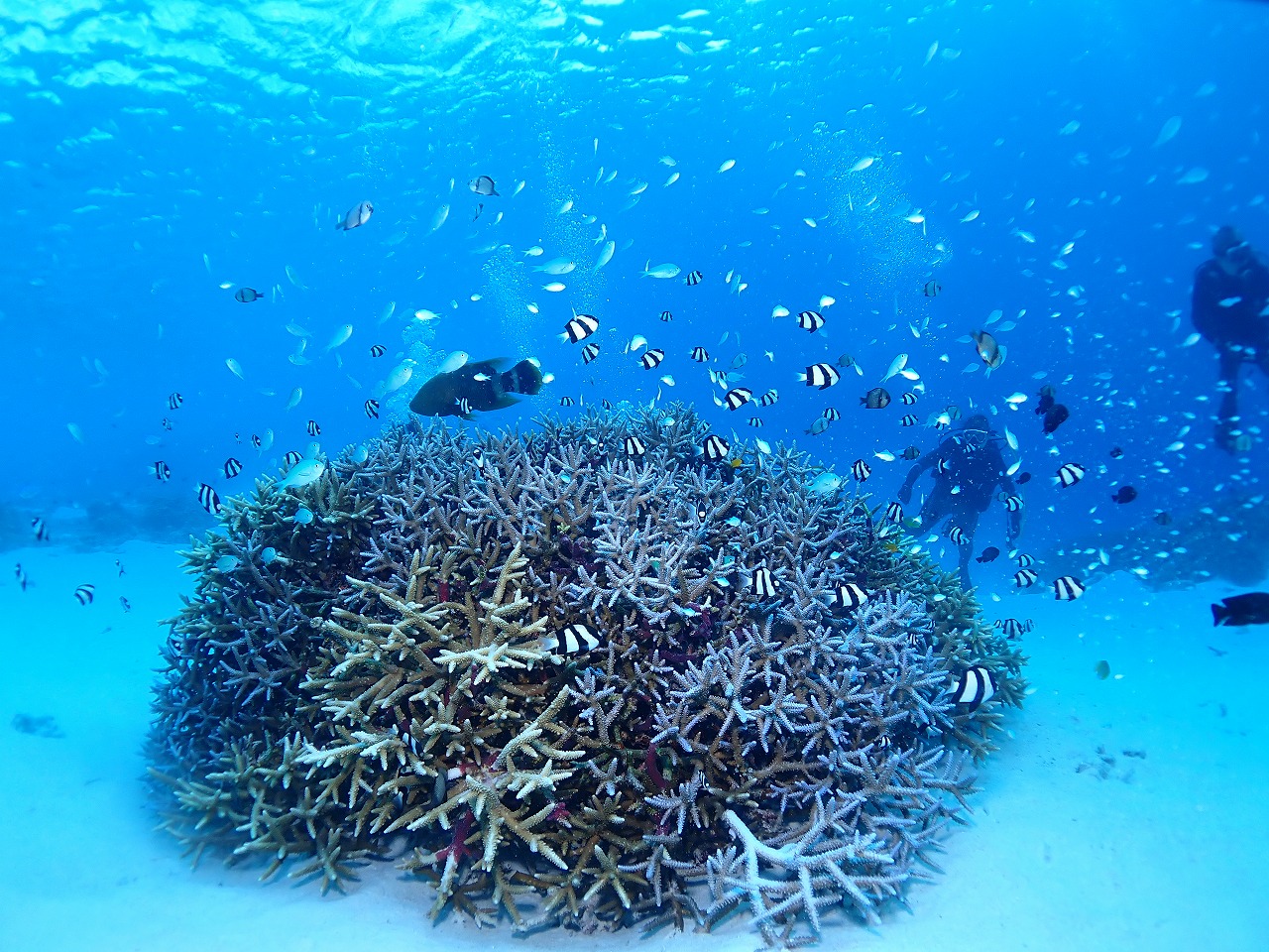 サンゴの周りに小魚がいっぱい。サンゴも魚もずっとキレイでいてくれるといいな。