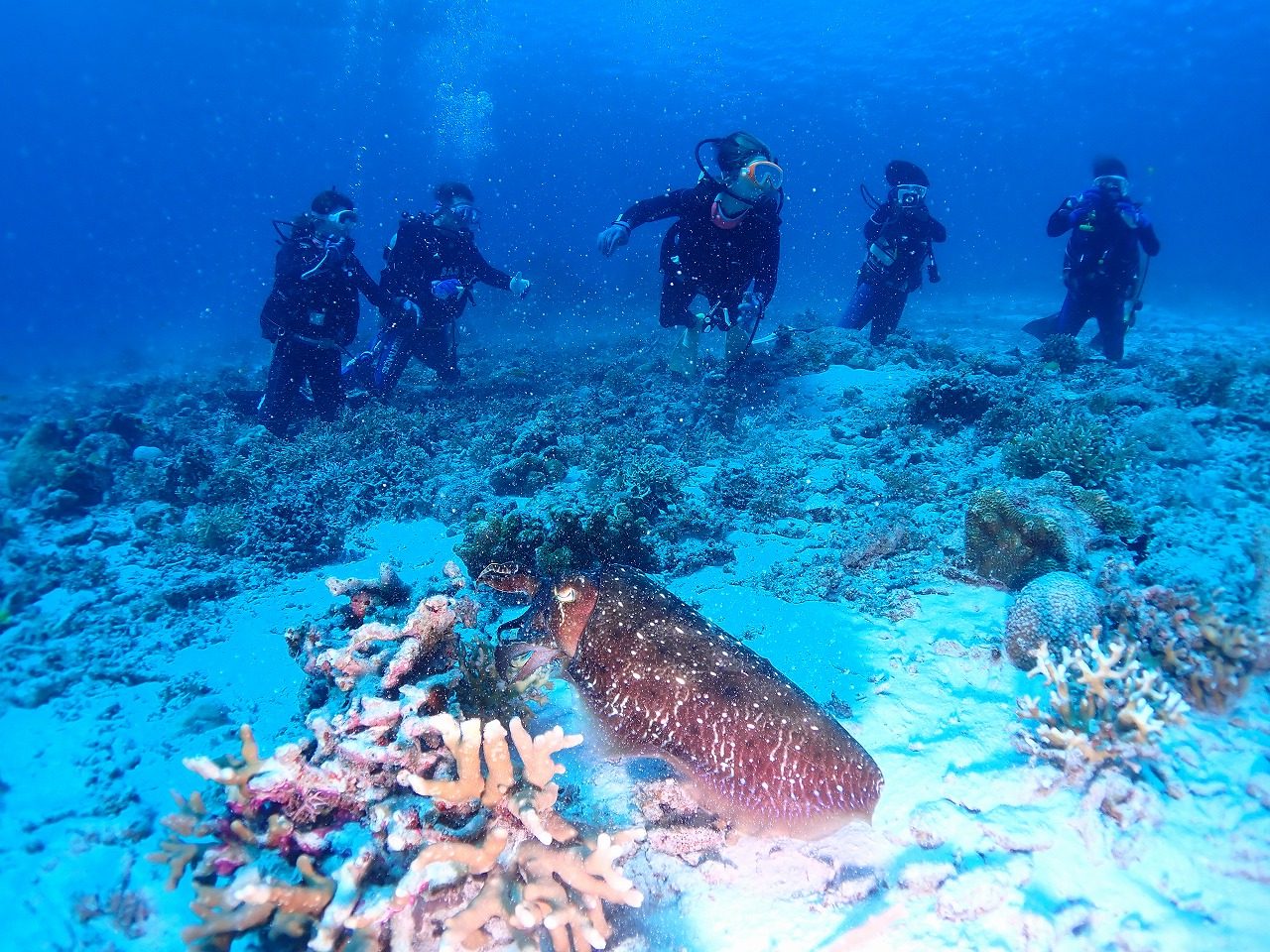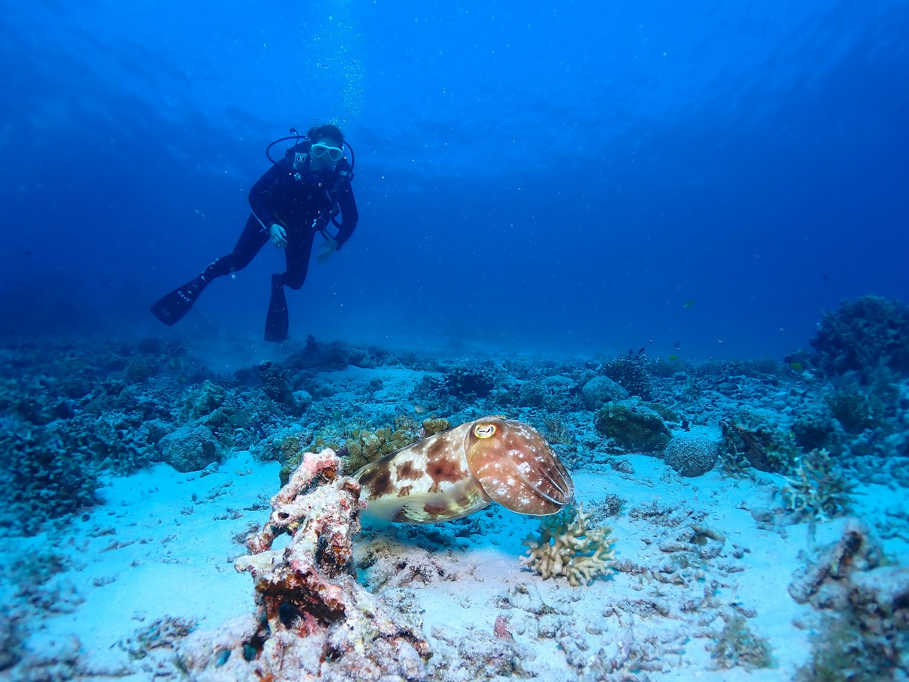 先日旦那様だけがアオウミガメとネムリブカに会ったので心配してたら、奥様はタイマイとコブシメ。